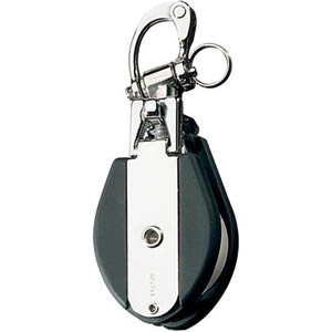 Easily operated latch mechanism Lightweight Soft resilient cheeks Sheave Diam. 2 in. Max. Rope Diam. 7/16 in. Max. Wire Diam. - in. Pin Diam. - in. Max. Working Load 1100 lb Breaking Load 2200 lb Weight 9.2 oz Snatch blocks are a tough and reliable solution for temporary leads and line deflection. Simple and quick to deploy, they can be easily opened when the load is released. The standard snap shackle head allows the block to swivel through 360�. Soft resilient cheeks reduce clatter and protect gelcoat and painted surfaces. Attachment point provided for shock cord hanger. Trunnion snap shackle provides the same swivel action and offers additional articulation from side to side.