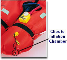 Small, compact, rugged, waterproof; pack inside inflatable life jacket or attach to standard life vest Pull-pin activation: Automatically lights when vest inflates or if manually pulled Adjustable flash shield for optimum eye protection Pull-pin lanyard clips to bottom of inflation chamber Light test feature with "Test Key" to ensure readiness-can be tested many times Easy to mount-fits on inflation tube via �O� Ring which will not damage inflation tube, or fits on any strap of conventional life jacket "Tamper Tab" breaks to indicate light has been activated Long term storage lithium battery-10 year storage life (recommended replacement 5 years from date of purchase-write month/year of replacement date on case at time of purchase) Operating life-approximately 8 hours continuous at -20�C (-4�F) Size: 3.1 L x 1.8 W x 1.6 D in (7.9 L x 4.6 W x 4.1 D cm) Weight: 2.8 oz (65 g) Material: UV stabilized composite polymer Color: Hi-Viz Yellow Operation: Pull-pin activation; automatic on some vests, manual activation when pulled by hand Beam Angle: 13� vertical; 2� horizontal Visibility: 15cd vertical; 2.5 cd horizontal; 2m (3.2 km) Lamp: Strobe light Battery Type: Lithium; 10-year storage life (5-year replacement life) Limited Warranty: 1 year