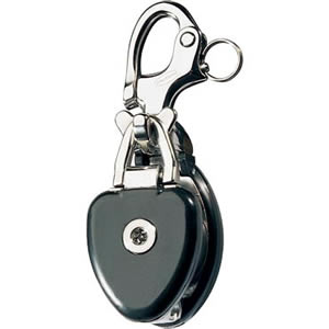 Easily operated latch mechanism Lightweight Soft resilient cheeks Sheave Diam. 1 3/4 in. Max. Rope Diam. 5/8 in. Max. Wire Diam. - in. Pin Diam. - in. Max. Working Load 3530 lb Breaking Load 7050 lb Weight 19.4 oz Snatch blocks are a tough and reliable solution for temporary leads and line deflection. Simple and quick to deploy, they can be easily opened when the load is released. The standard snap shackle head allows the block to swivel through 360�. Soft resilient cheeks reduce clatter and protect gelcoat and painted surfaces. Attachment point provided for shock cord hanger. Back to Top Applications * Removable spinnaker sheet deflector blocks for boats up to 11m (36ft) * Temporary sheeting point while changing sheets for boats up to 11m (36ft) * Temporary reefing block for boats up to 11m (36ft) * Spare or replacement block for general use on larger boats depending on line angle and load * Temporary outboard sheet lead for headsail trimming Back to Top Materials * Grade 316 stainless steel frame and load strap * Hardcote anodised alloy sheave * Soft PVC cheeks * Investment cast Grade 15-5PH stainless steel snap shackle