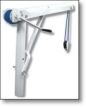 CARGO MATE This heavy duty white power coated aluminum heavy lifter mounts and dismounts with ease. CargoMate stows neatly in a quality bag, and complete tackle is included. Winch drum capacity provides for 13 vertical feet of lift. With greater lift capacity, the unit should be thru-deck mounted on sailboats and coaming or transom/swim step mounted on power boats. Deck flange and universal base mount provided as standard. 33" column extensions available. The Big Brother to Motor Mate� Lifting capacity: 250 lbs. Integral ratchet type winch provides 15 to 1 lift ratio For both Power & Sail Boom length: 34� Assembled height: 54�+