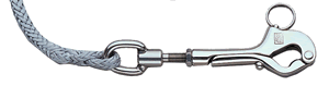 Over center pelican hook with with threaded eye for use with high tech cordage instead wire.