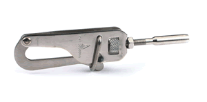 Stainless, safe, inexpensive design Practical Sailor called a "well engineered hunk of metal". Adjusts in place with knurled nut, stamped metal construction - 3 1/4" long from end of body to inside bearing point of hook.